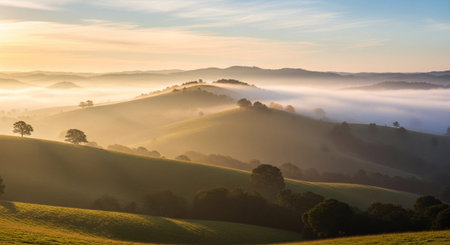 A landscape unfolds as a golden sunrise casts its warm light over rolling hills. A thick layer of mist blankets the valleys, creating a soft, ethereal atmosphere. Scattered trees dot the green slopes, their forms softened by the diffused morning light. Sunbeams pierce through the haze, highlighting the undulating terrain and the gentle curves of the hills. The sky transitions from soft yellow and orange near the horizon to a pale blue overhead, with wispy clouds adding texture.