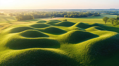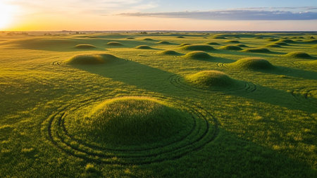 Aerial view of a vast green field with unique circular mounds and concentric rings, bathed in the warm light of a golden sunset.