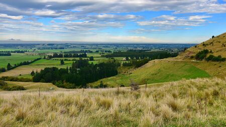 View of scenic Canterbury Plains from Lees Valley in Canterbury, New Zealand