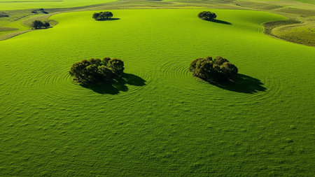 An aerial perspective reveals undulating green fields with distinct circular patterns in the grass and clusters of trees casting deep shadows.