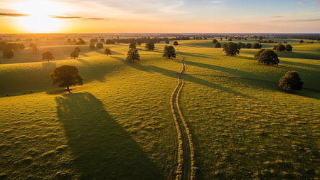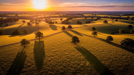 Golden hour sunlight bathes rolling green fields with scattered trees, casting long shadows and highlighting winding paths across the landscape.