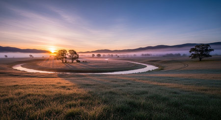 A serene landscape with rolling hills blanketed in a soft, golden mist at dawn. Solitary trees stand silhouetted against the misty backdrop, creating a tranquil and ethereal scene with sunlight softly illuminating the landscape.