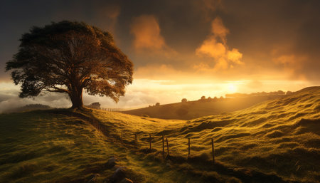 Tranquil sunset, meadow beauty, old fence in nature embrace generated by artificial intelligence