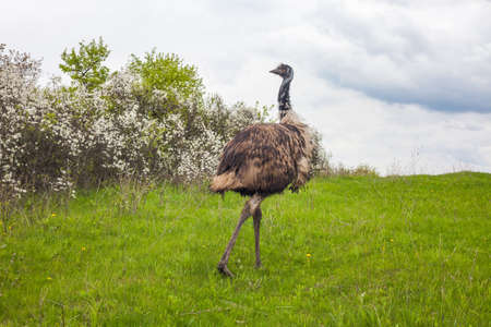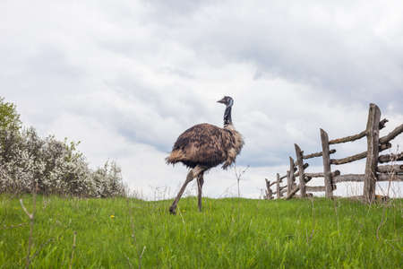 Herd of brown llamas after a haircut is grazed on a green lawn. The concept of exotic, ecological and photo tourism. Animal breeding farm for wool and meat