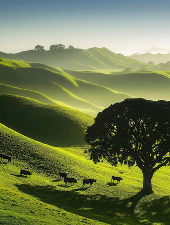 (2475) showing sunrise over rolling green hills with long shadows cast by scattered trees and a misty atmosphere, illuminated by golden sunlight keywords: sunrise,...