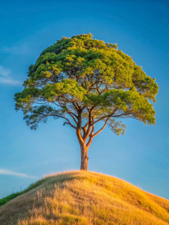 With showing serene rolling green hills under a bright sunny sky with a lone tree casting long shadows across the lush landscape at golden hour. resolution...