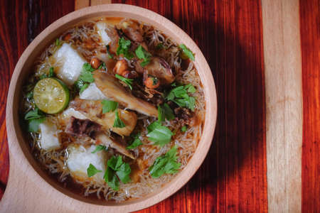 A bowl of mutton curry noodle mutton or mee kari kambing with stone wall insight. Famous and another food innovation from Malaysia