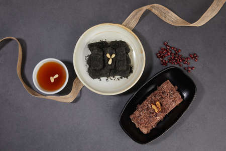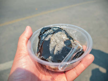 Original Chinese Black jelly or Grass Jelly in tourist Hand at Chaozhou City China.