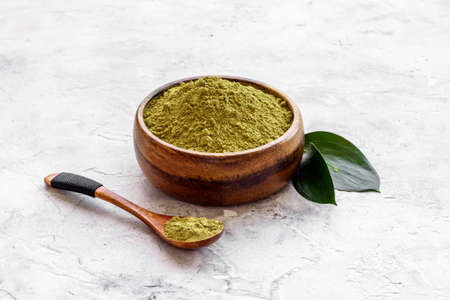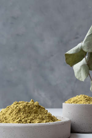 henna powder for dyeing hair and eyebrows and drawing mehendi on hands on a gray cement pedestal with dried flowers or a white flower.