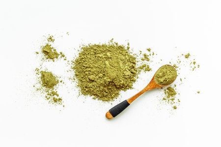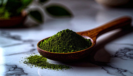 A wooden spoon with scattered green natural leaf powder.