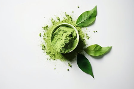 Matcha green tea powder in bowl on white background with shadow.
