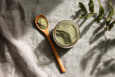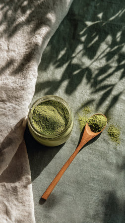 A small glass jar filled with green powder sits beside a wooden spoon on a light fabric surface. The natural setting is enhanced by soft lighting and nearby greenery.