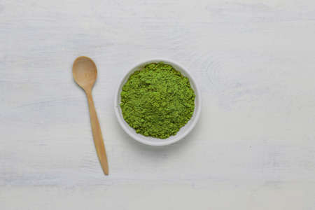 wooden spoon with green powder of matcha on white background, closeup macro shot, top view.
