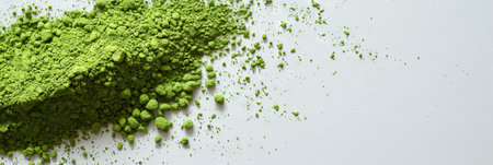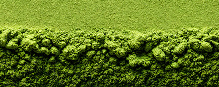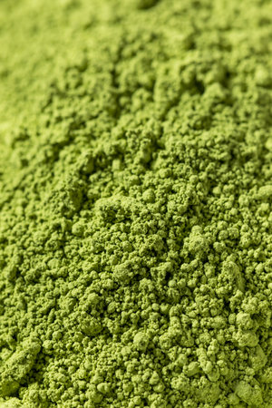 Finely ground matcha powder with uneven texture forms a natural abstract pattern, perfect for culinary, health, and minimalist backgrounds.