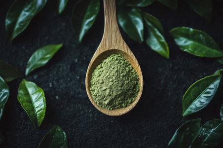 Green matcha powder in a wooden spoon with tea leaves
