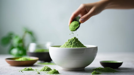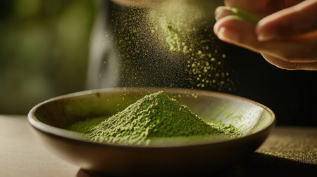 Close-up image of green matcha powder being sprinkled from a hand into a round bowl, showcasing the vibrant color and fine texture in a cozy kitchen setting.