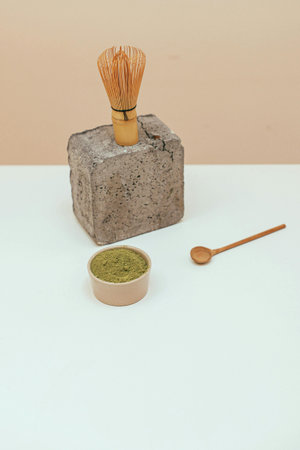Matcha tea. Tea ceremony with dry powder and hot drink