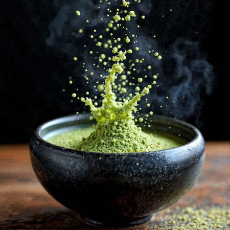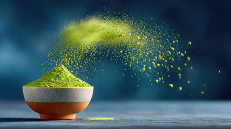 Matcha powder explosion. Vibrant green matcha tea powder creates a dynamic splash in a traditional black ceramic bowl against a moody dark background.