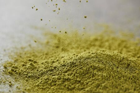 selective focus of green matcha powder pouring on table