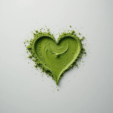 Green powder in shape of heart on white background, top view.
