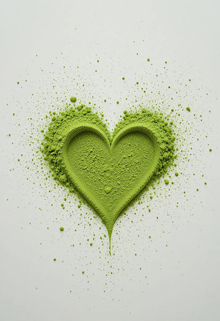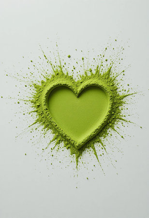 Heart made of green powder on a white background with copy space.