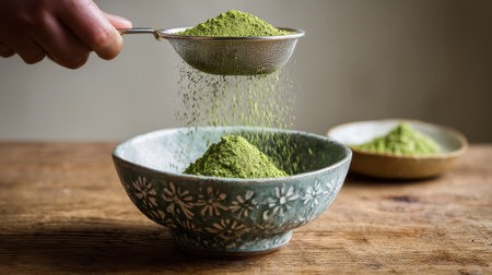 A hand sifts green matcha powder into a beautifully decorated bowl enhancing the tea preparation process.
