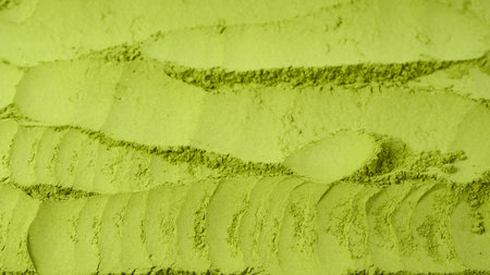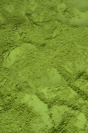 Rough textured green matcha powder surface creates a natural background with rich organic feel.