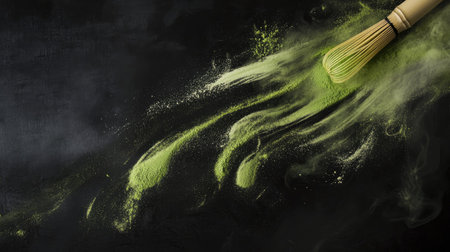 Bamboo whisk with trails of floating green matcha powder, creating a soft, magical effect on black canvas