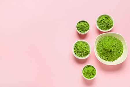 Bowls with powdered matcha tea on color background