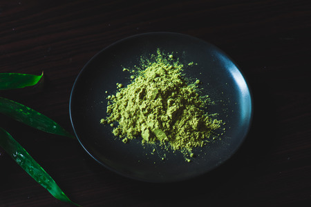 Matcha tea powder with green leaf. Asian beverage concept