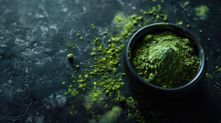 Matcha tea powder in a black bowl on a textured surface
