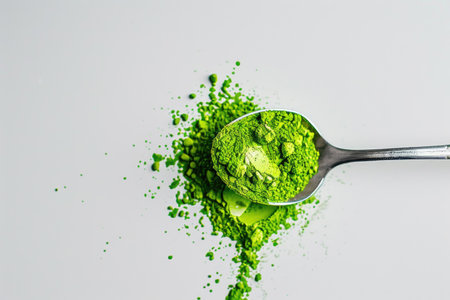 A spoonful of vibrant matcha powder on a white background