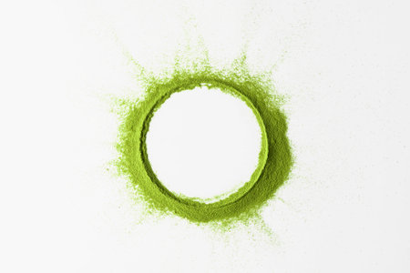 Ring of bright matcha powder framing white space on white background that creates organic texture and simple mockup space.