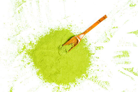 Matcha tea powder in the form of an inscription on a white background. Top view.