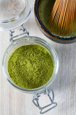Organic green tea Matcha powder with Japanese tools Chasen bamboo whisk, Chashaku spoon. Japanese food. Vegetarian healthy drink, beverage.