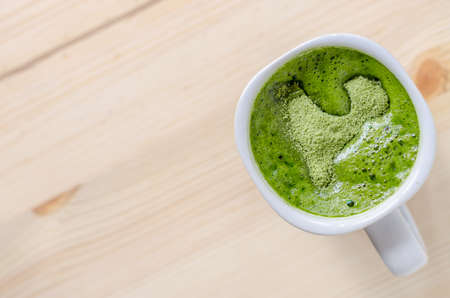 Top view on asian decorated matcha green tea latte art on the wooden table, horizontal