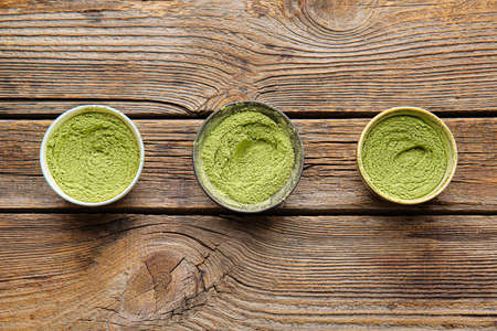 Japanese green matcha latte, matcha powder, bamboo whisk for whipping on old wooden board. Matcha tea healthy organic product rich in antioxidants. Top view.