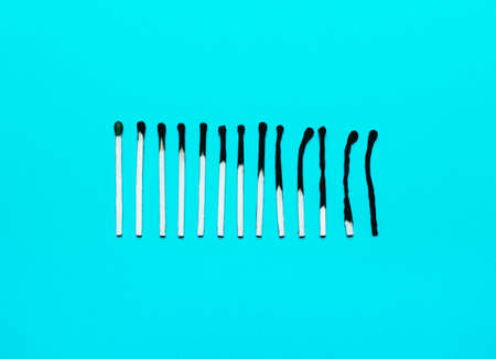 Burned matches in a row on a blue background. The concept of depression, extinction, illness, burnout, aging. View from above, flat