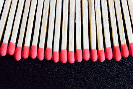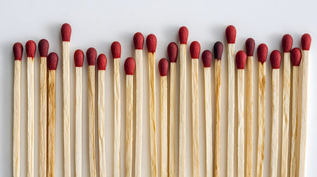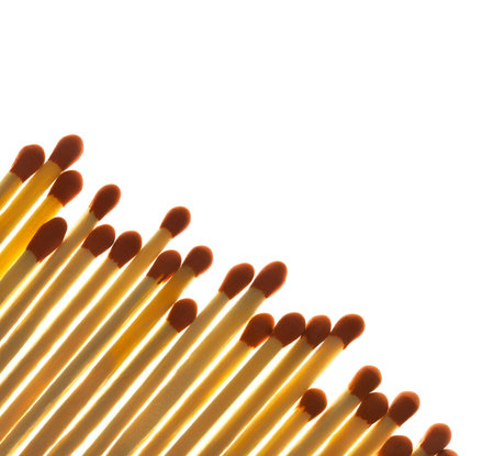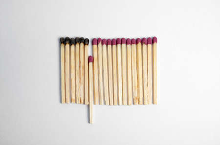 Matches with red tips standing upright in an uneven line on a white background, symbolizing concepts of danger, potential, leadership, and diversity in a group