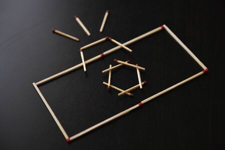 Camera from matches on a black wood. Concepts of matches, picture camera.