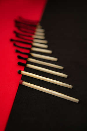 Burnt matchsticks and new matchsticks on white background. Different stages of matchsticks.
