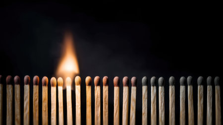 View of a lit match positioned in front of a neat line of unlit matches. The warm light of the flame stands out against the muted background.