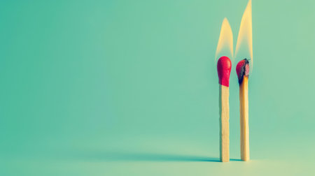 Two burning matches on pastel blue background, ideas, emotional burnout, teamwork. Generative AI.