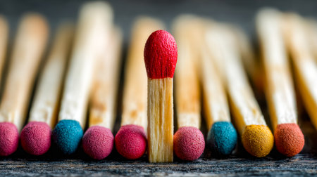 A collection of matchsticks with red, human-like heads, highlighting one blazing fiercely amid a soft-focused backdrop, symbolizing individuality and ignition dreams