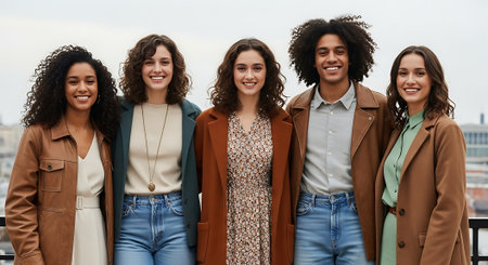 Young professionals in vibrant atmosphere stand against a neutral backdrop, exuding confidence and positivity