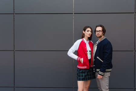 young couple in stylish jackets looking at camera while standing near gray wall