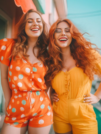 Two smiling friends going to shopping in summer morning and telling each other funny stories Outdoor portrait of lovely girls in bright colorful shirts hanging out togeth : Generative AI