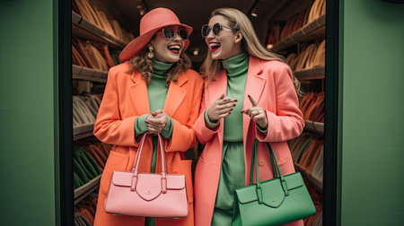 Two best friends both dressed in fun and fashionable attire exit a trendy store with bags in hand. One bag is a lively shade of coral the other a vibrant shade of lime green. They share a heartfelt laugh clearly thrilled with their shopping spree.
