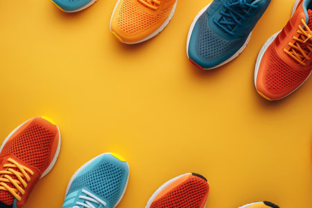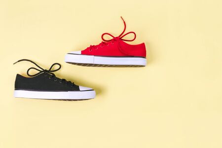 Group of colorful sneakers on yellow background. Top view. Flat lay.
