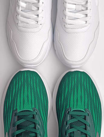 Two pairs of sneakers on a neon color background. White and red shoes. Top view